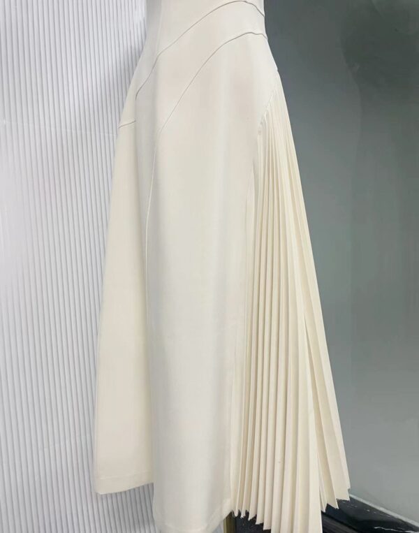 The halter-style neckline, keyhole detail, and asymmetric pleated panel add softness and architecture, creating a dress that photographs flawlessly and moves with graceful structure. Cream/apricot tones elevate your skin glow (slight variation may appear due to camera light), making Renata a timeless choice for elevated occasions