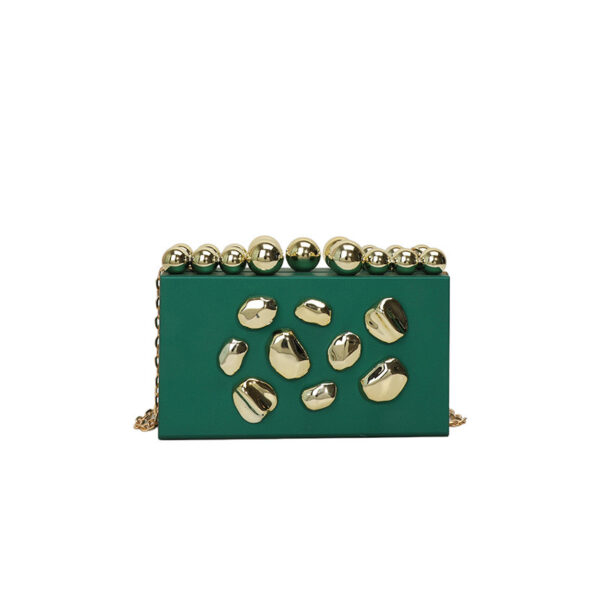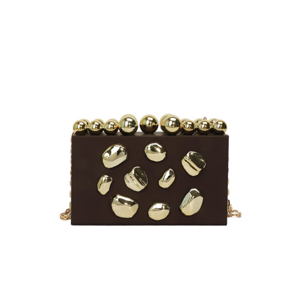 A sculptural statement clutch adorned with glossy gold pebble hardware — elegant, modern, and the perfect finishing touch to elevate any outfit.