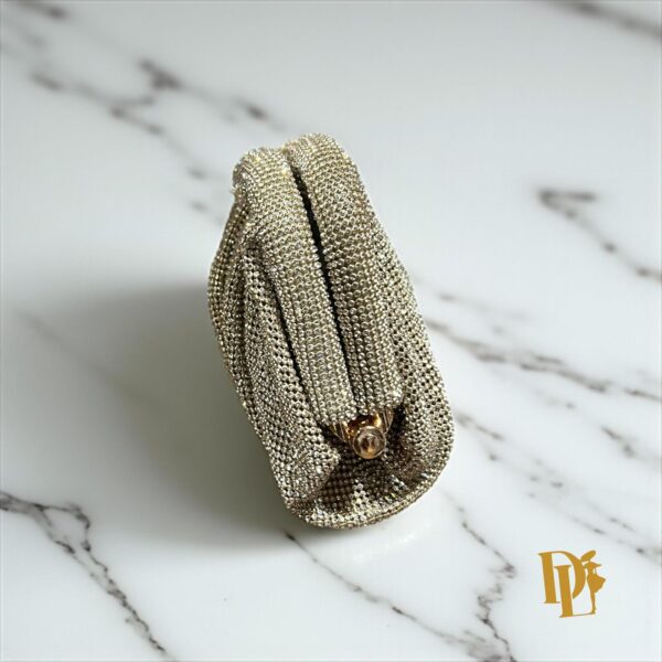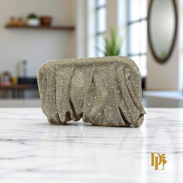 The Champella Glimmer Crystal Clutch is where quiet luxury meets radiant sparkle. Wrapped in soft champagne gold and adorned with hand-applied micro-crystals, this clutch glistens with effortless glamour. Its ruched silhouette and vintage gold-tone kiss-lock clasp bring timeless sophistication to every look.