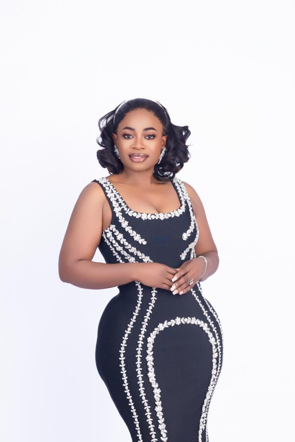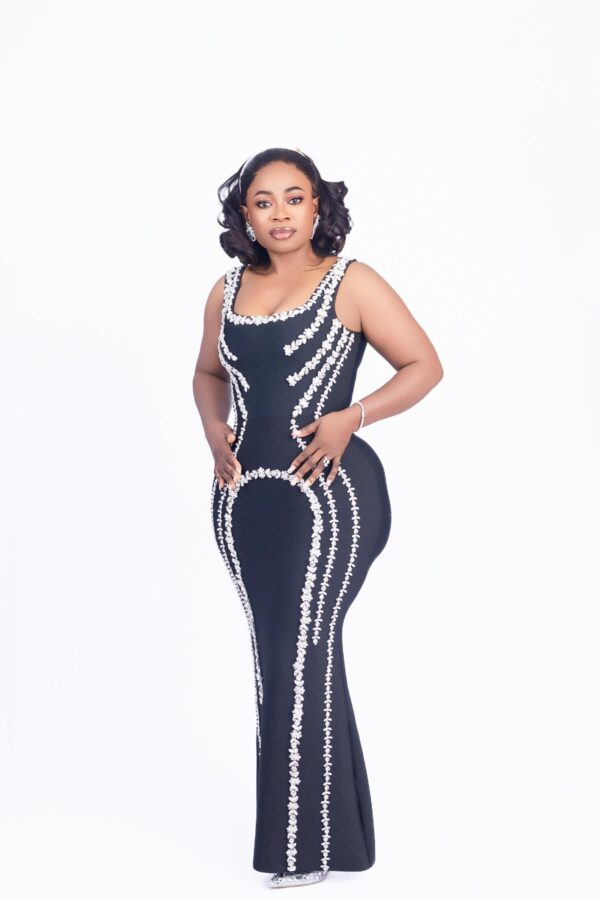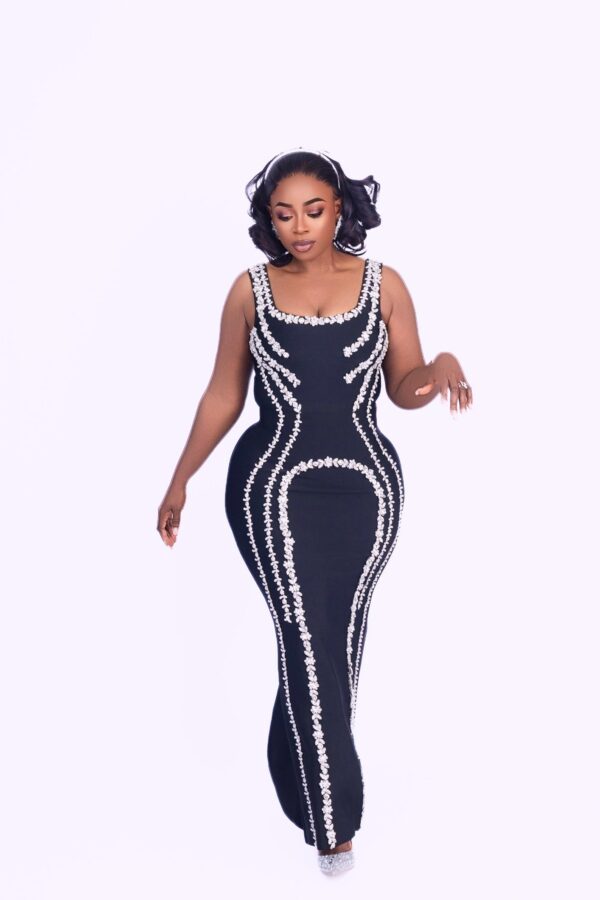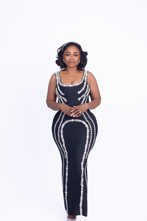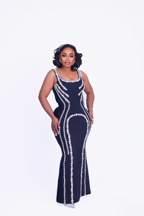 Command attention in our Crystal Trace Bandage Gown — a sleek black masterpiece adorned with silver crystal embroidery that contours every curve with elegance and power.