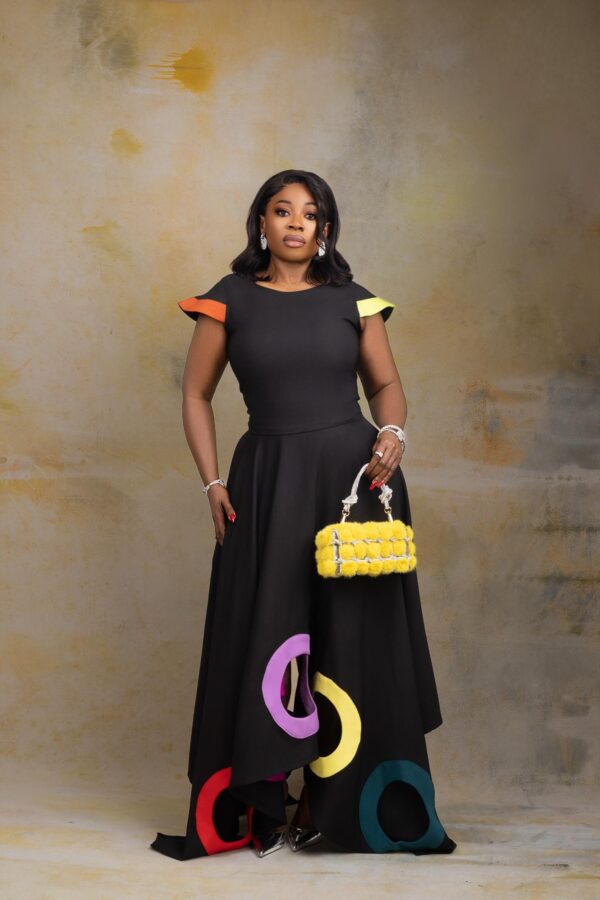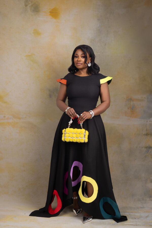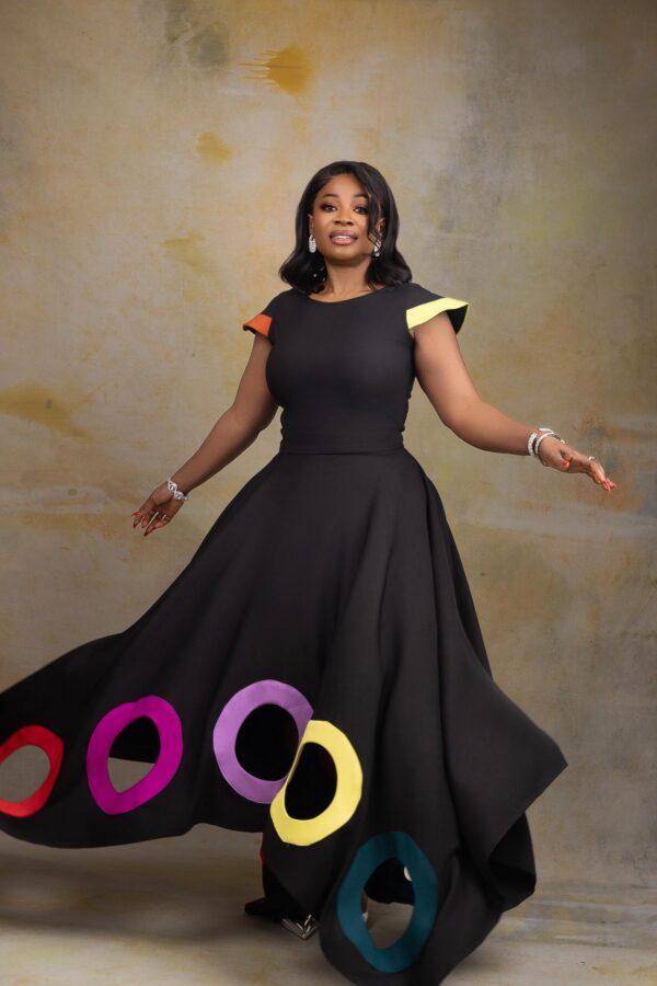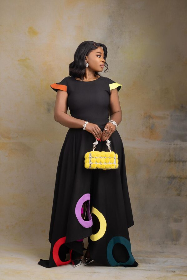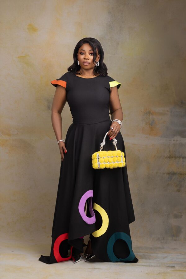 Step boldly into the spotlight with Kaira Chromatique set— a true signature statement from Divag Luxurii’s Limited Edition Looks. Designed to embody creativity and elegance, this two-piece set features a sculpted black top with artistic color-blocked cap sleeves in bright yellow and orange, paired with a full circle skirt showcasing vibrant oversized appliqué rings in red, fuchsia, lilac, yellow, and teal.