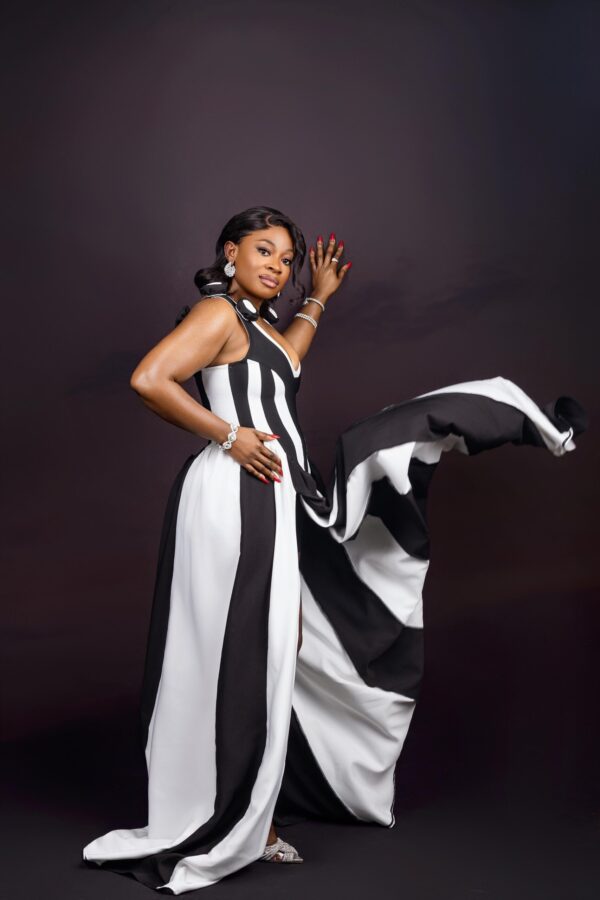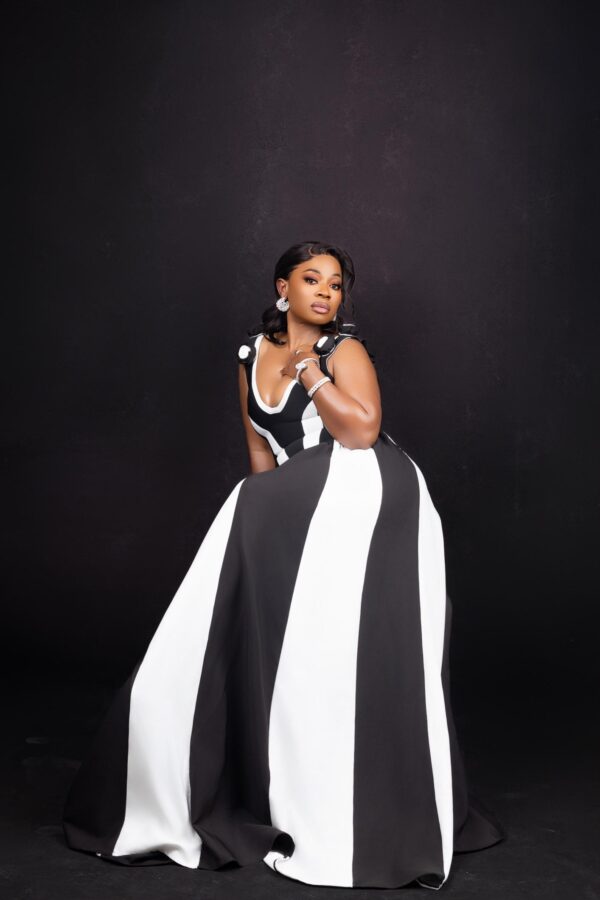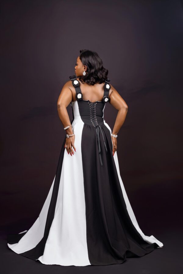 Step into commanding elegance with Mariah stride Gown. This black and white floor-length gown is designed to elongate, flatter, and mesmerize, with bold vertical paneling and a flowing high-slit skirt that moves like royalty.