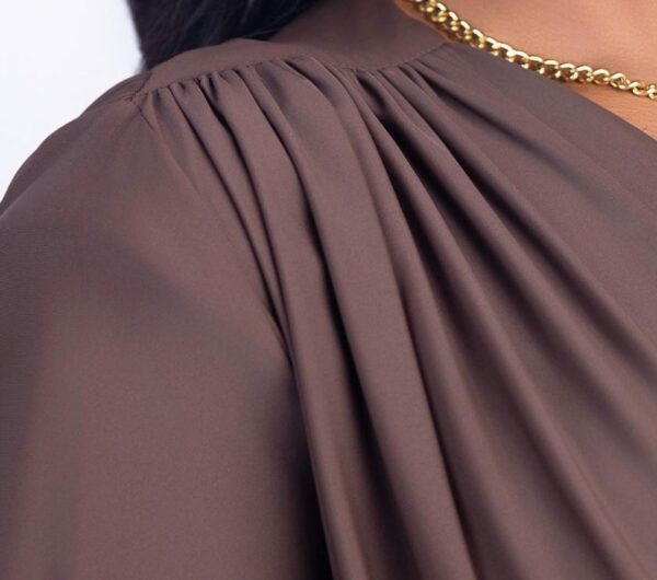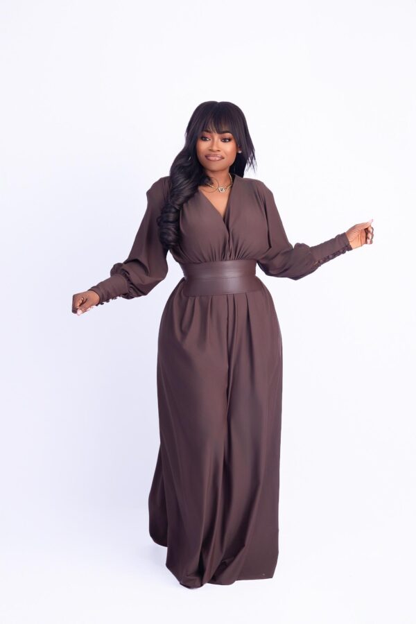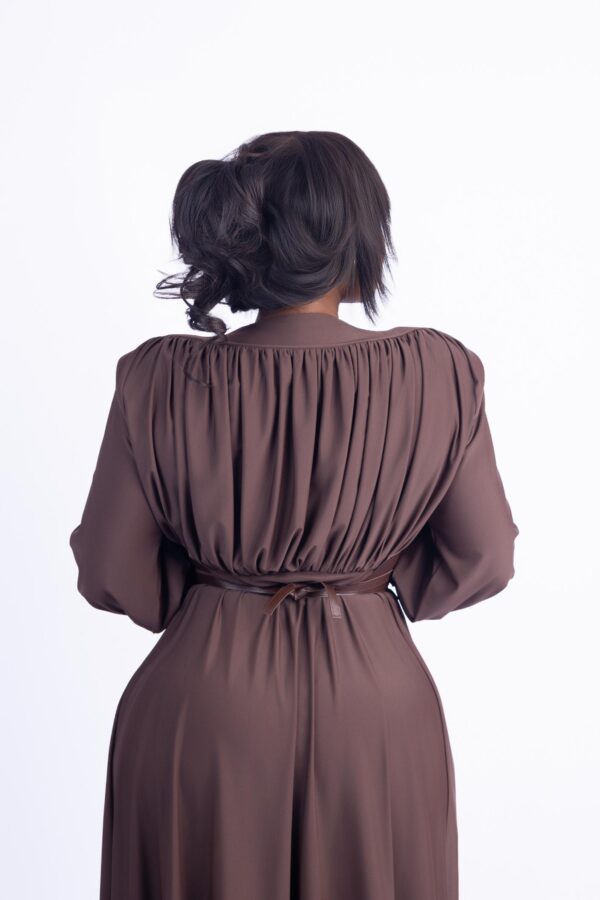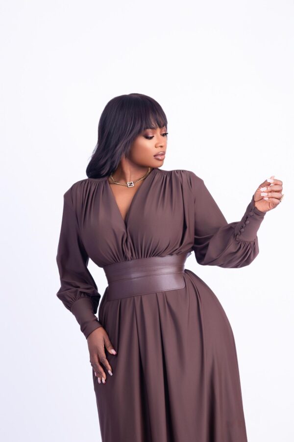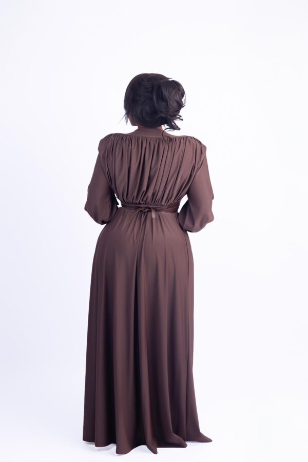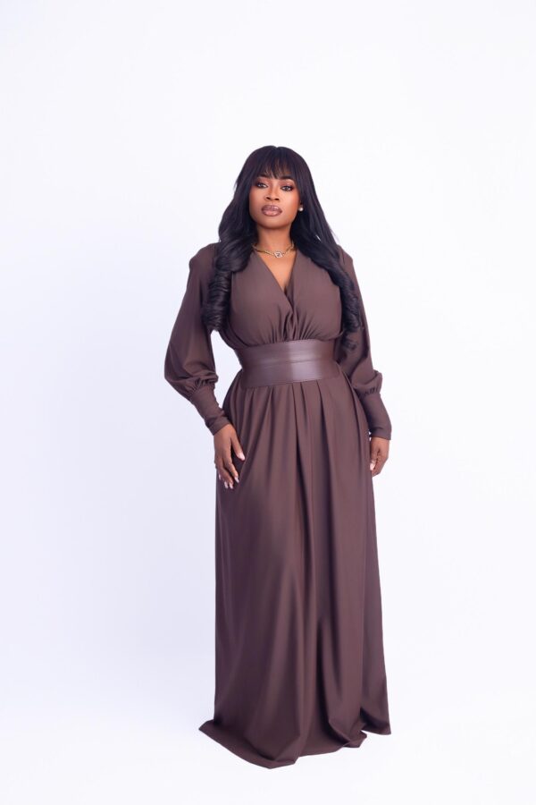 Elevate your elegance in our Valencia Mocha Majesty Gown. Designed in a rich mocha brown, this floor-length gown features a flattering V-neckline, pleated bodice, and a structured faux leather waistband that defines your silhouette. The soft-flowing skirt and voluminous bishop sleeves with buttoned cuffs add a regal touch—perfect for formal dinners, weddings, or special photoshoots. Gathered pleats at the back and a tie-waist detail create graceful movement from every angle.