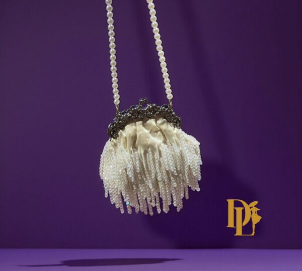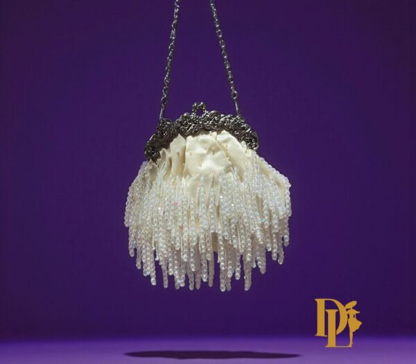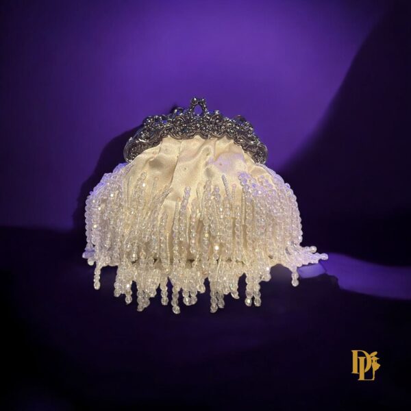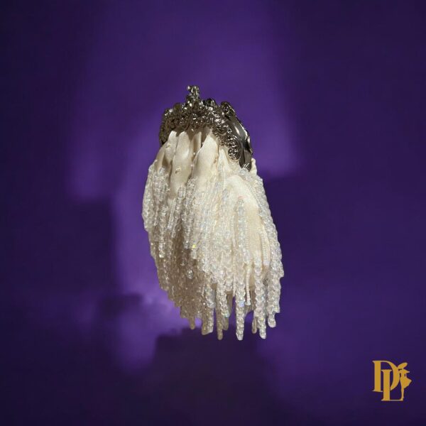 Refined and radiant, the Velina Frost clutch glistens with icy crystal beadwork over soft ivory satin. Finished with a sculpted metallic frame, it’s a modern heirloom designed to turn heads at any event or galas. Comes with two straps pearl and Metallic