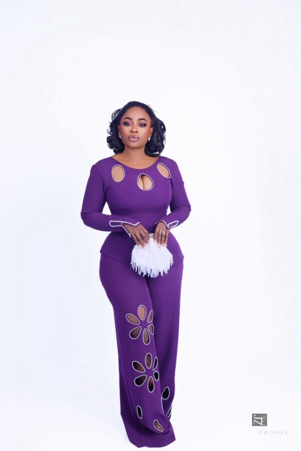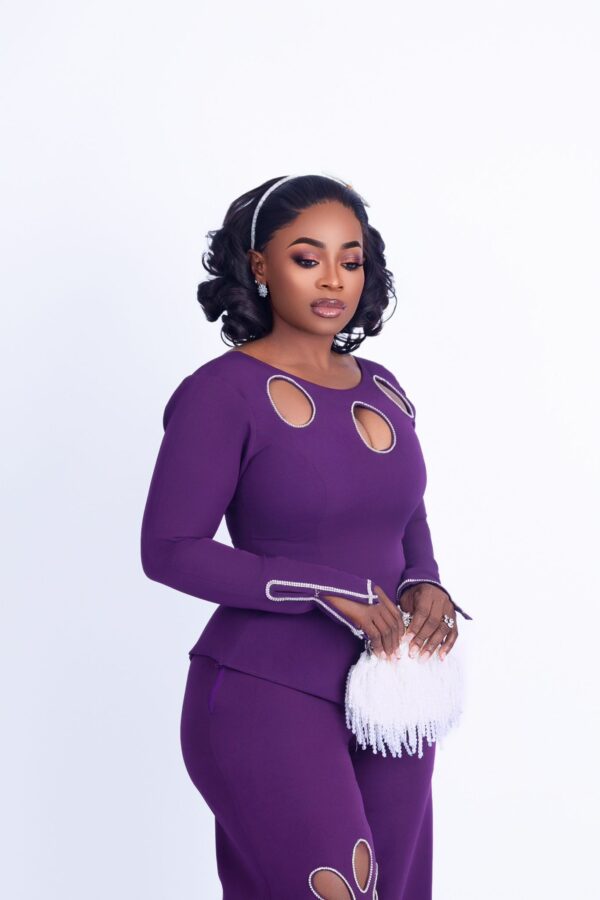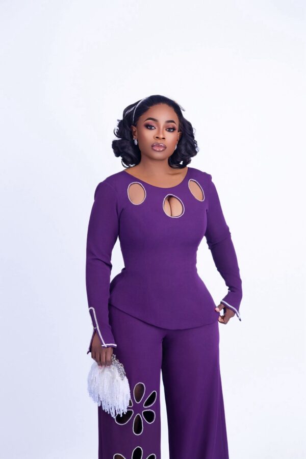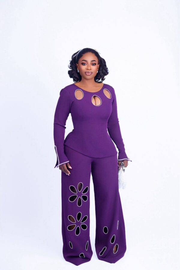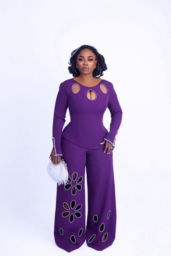 Paired with wide-leg pants blooming in floral-inspired cutouts detailed with hand-placed crystals, this set is for the woman who owns her spotlight. Whether for a signature birthday, red carpet event, or fashion-forward celebration, Viora Plum Bloom brings unapologetic presence to every step.Viora doesn’t just show up she owns every petal of attention.
